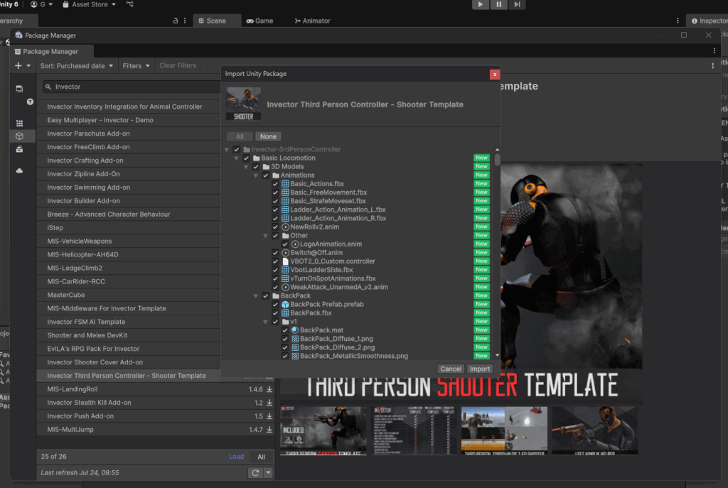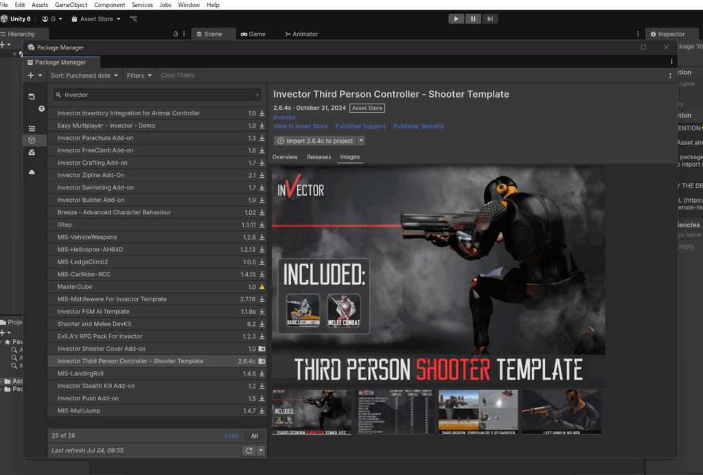 Invector>Import ProjectSettingsからシーンのセットアップが必要です。