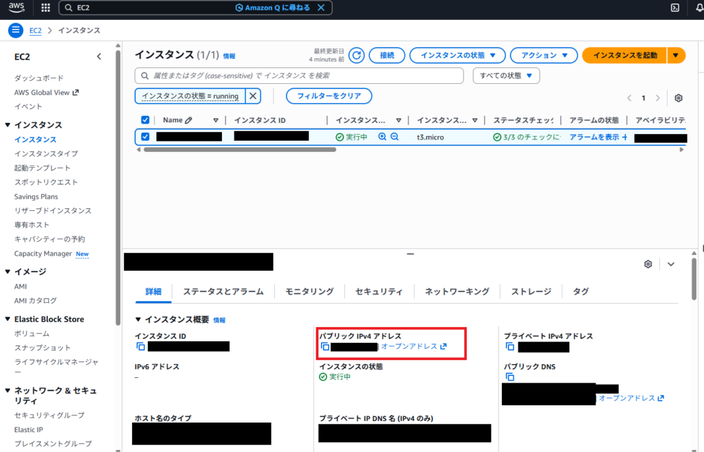 AWSで立ち上げたインスタンスのパブリックIPアドレスを確認します。ここで確認したIPアドレスにTera Termから接続します。