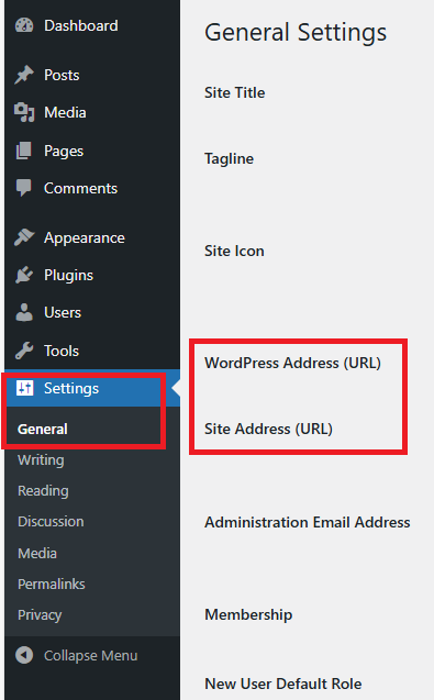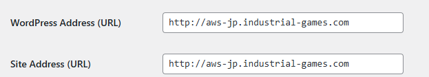 管理画面へログインしたら、Setting > GeneralのWordPress Address (URL)とSite Address (URL)がIPアドレスになっているので、先ほどRoute 53で指定したドメインをここに入力します。