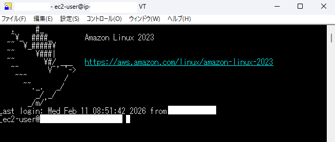これでTera Termで立ち上げたEC2インスタンス(Amazon Linux 2023)に接続できました。