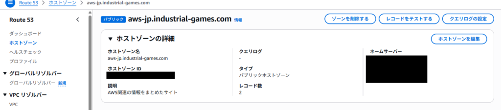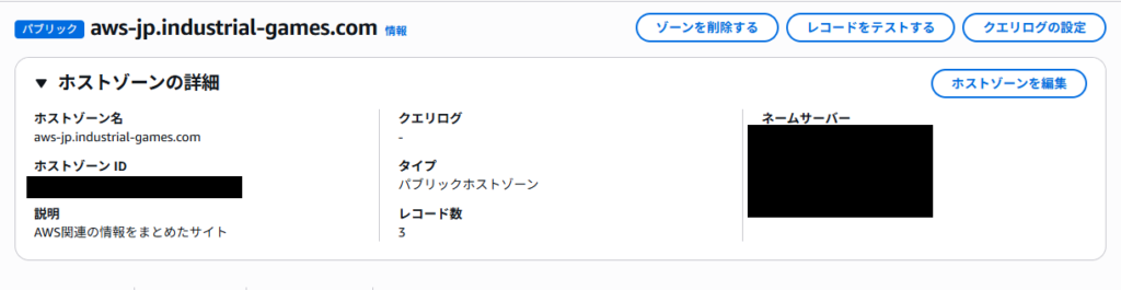 まずはパブリックホストゾーンを設定した画面を確認します。ここで確認できるネームサーバーを抑えておきます。