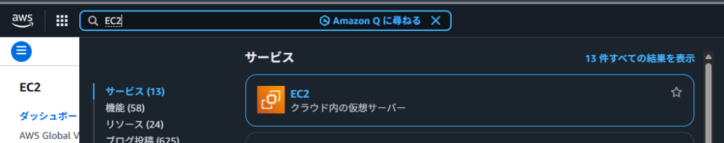 AWSのアカウントにログインしたら、左上の検索窓からEC2を検索して選択します。