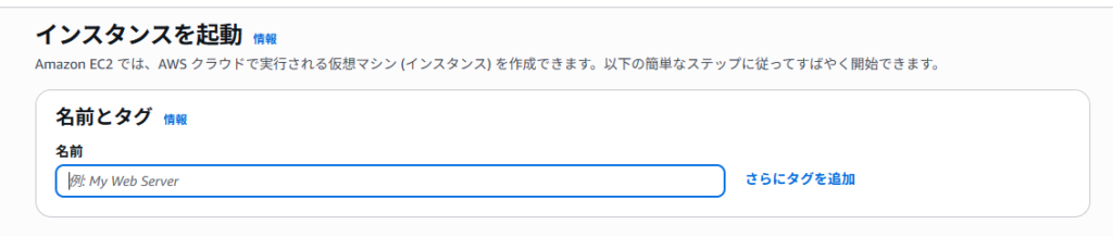 まずは名前とタグです。インスタンスの名前を設定します。インスタンスを管理する自分たちが理解できるよう名前を付けます。この名前は特に公開されるものではありません。
