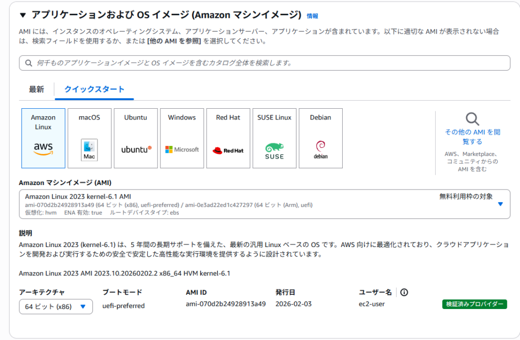 まずはAmazon Linux 2023をEC2上で立ち上げます。
