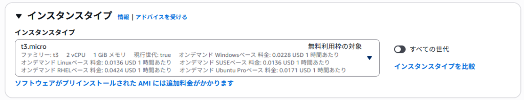 インスタンスタイプを選択します。インスタンスタイプは、CPUとメモリなどのスペックを選択できるものです。あとからインスタンスを停止した状態でインスタンスタイプは変更したいときに都度変更できます。インスタンスタイプの選択による課金は、インスタンスを起動している時間ごとに課金されます。インスタンスを停止していれば課金はされません。