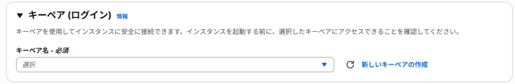 キーペアを設定します。このキーペアを設定して生成される.pemファイルを利用してTera TermでAmazon Linuxにログインします。
