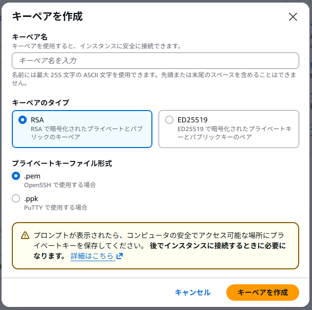 上記画像の右側の「新しいキーペアの作成」をクリックして以下のウィンドウを表示し、必要な情報を入力して「キーペアを作成」ボタンを押下して.pemファイルをダウンロードします。ダウンロードした.pemファイルは後でAmazon Linuxにログインするのに使用します。