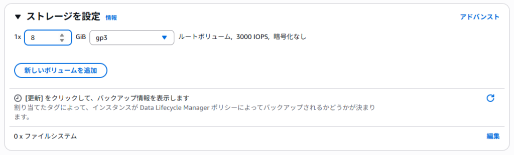 ストレージを設定します。ここで設定するストレージはEBSで、インスタンスを起動していなくても課金されます。gp3で8GBであれば1カ月$0.64(約 80 円前後)の費用が発生します。今回は余裕を持たせるために15GBに設定(月額160円程度課金される)します。なお、ここで設定するこの容量は後から拡張することができます。