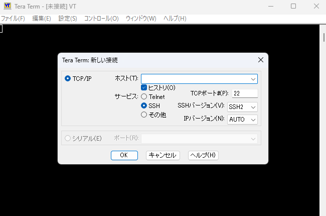 Tera Termを起動したら「ホスト(T)」にIPアドレスを入力します。その他の設定は変更せずにOKボタンを押下します。