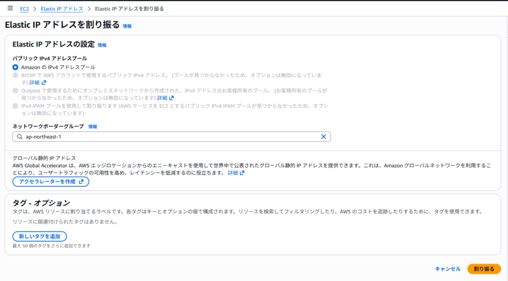 AWSのEC2上に立ち上げたインスタンスは、停止して起動するたびにパブリックIPv4アドレスが都度変わります。これを防ぐために、Elastic IPを使って固定のパブリックIPv4アドレスを割り当てます。