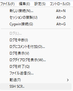 Tera Termで今回立ち上げたEC2上のAmazon Linuxに接続してファイル(F)>SSH SCP…をクリックします。