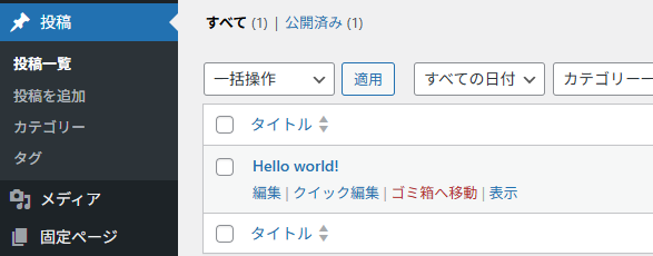 投稿>投稿一覧から、Hello world!をゴミ箱へ移動させ、そのうえでゴミ箱からも削除しておきましょう。