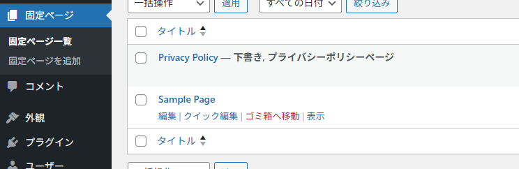 固定ページ一覧にもSample Pageが用意されています。こちらも特に必要ないので削除しましょう。