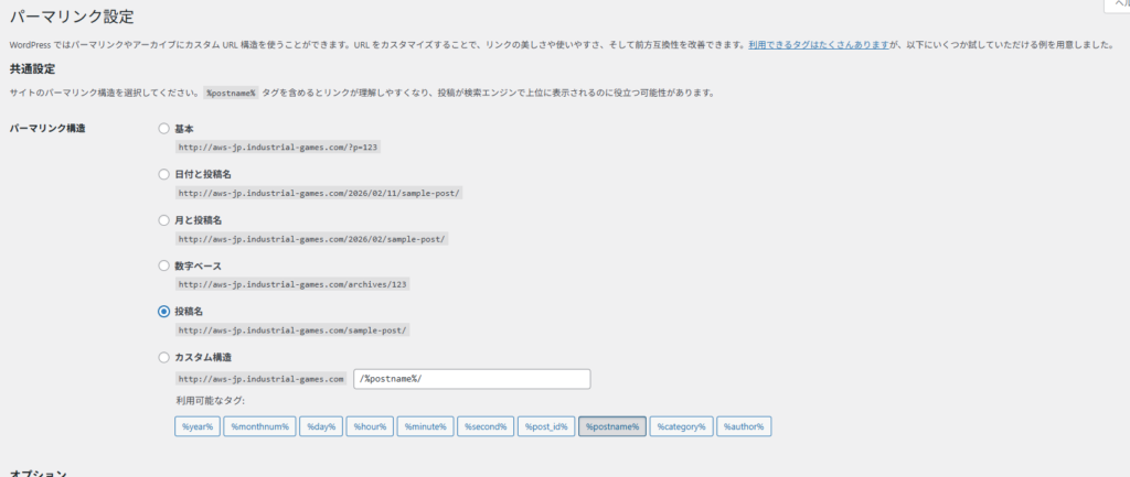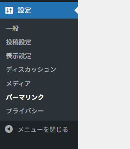 WordPressの管理画面にログインしている状態で「設定」>「パーマリンク」からパーマリンクを設定します。このパーマリンクは投稿機能で記事を作成したときに記事のURLの末尾の文字列を決める設定です。