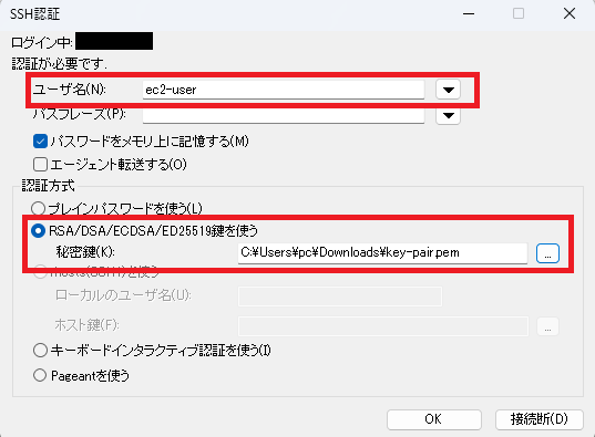 ユーザー名にec2-user、認証方式にRSA/DSA/ECDSA/ED25519鍵を使うを選択して秘密鍵(K)にEC2インスタンスを立ち上げるときに「キーペアを作成」でダウンロードした.pemファイルを指定します。
