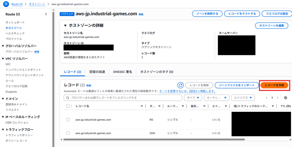 作成したホストゾーンにレコードを作成ボタンを押下してAレコードを追加します。Aレコードは、IPv4アドレスとドメイン名を紐づけるために使用するレコードです。