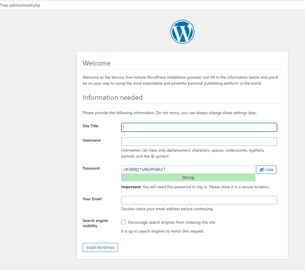 ブラウザからインスタンスのIPアドレスを入力してアクセスするとWordPressのインストール画面が表示されます。必要な情報を入力してWordPressのインストールを開始します。メールアドレスはWordPressのパスワードを再設定するときに使用します。