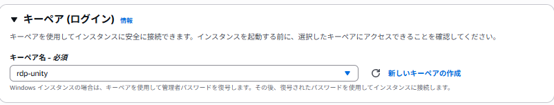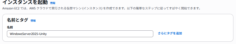まずはUnityを使ってWindows Server上でゲームを開発していくので、今回はインスタンスの名前を以下の画像のように(WindowsServer2025-Unity)設定します。