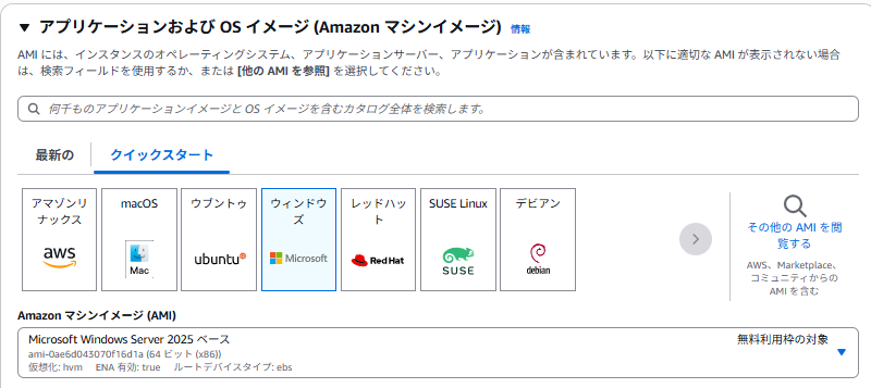 「アプリケーションおよびOSイメージ(Amazonマシンイメージ)」で「Microsoft Windows Server 2025 ベース」を選択します。