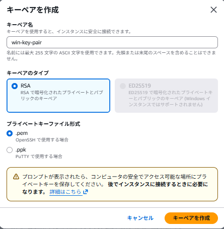 新しいキーペアの作成をクリックしてキーペアを作成します。