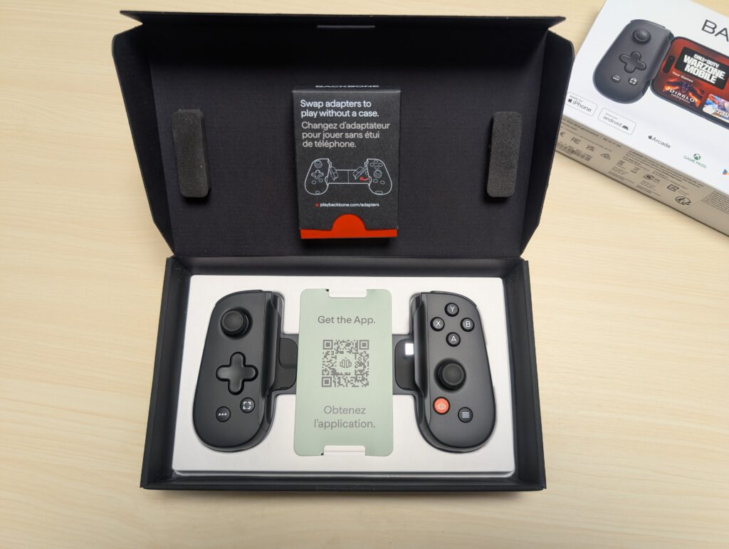 パッケージのふたを開けると、Backbone Oneがすぐに確認できます。QRコードの画像が表示され、Backboneのアプリインストールが推奨されます。