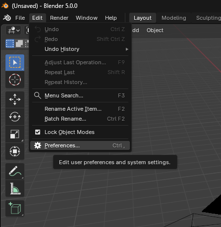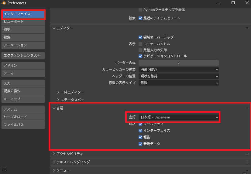Blenderインストール時点で英語になっている場合、左上の「Edit>Preferences」をクリックして設定ウィンドウを立ち上げ、インターフェースタブから言語を日本語に設定します。