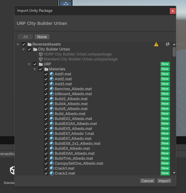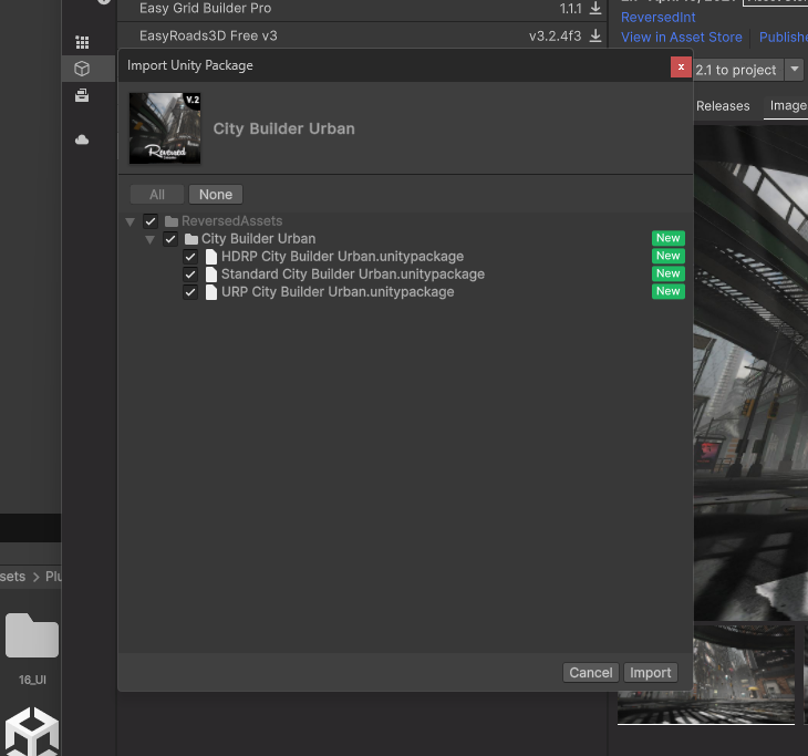 URP City Builder Urban.unitypackageをダブルクリックすると以下のウィンドウが表示されます。