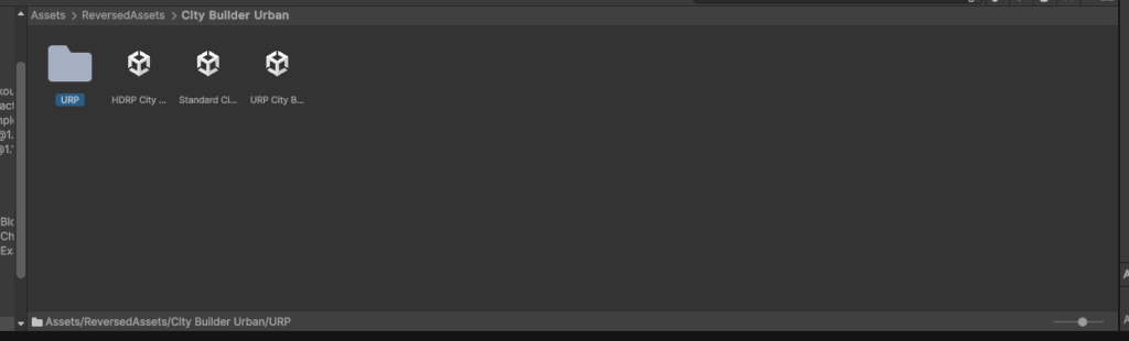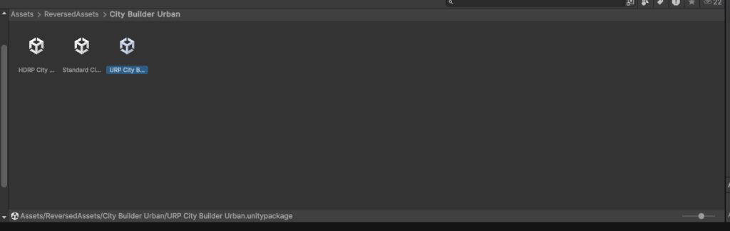 Assets>ReversedAssets>City Builder Urbanフォルダへ移動します。以下の画像の通り、インポートした.unitypackageファイルが3つ格納されています。今回はURPのプロジェクトにインポートするので、URP City Builder Urban.unitypackageをダブルクリックしてファイルをインポートします。