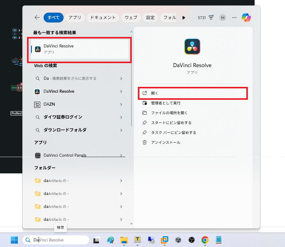 インストールしたDaVinci Resolveをまずは起動します。Windows11であれば左下からDaVinci Resolveを検索して起動します。