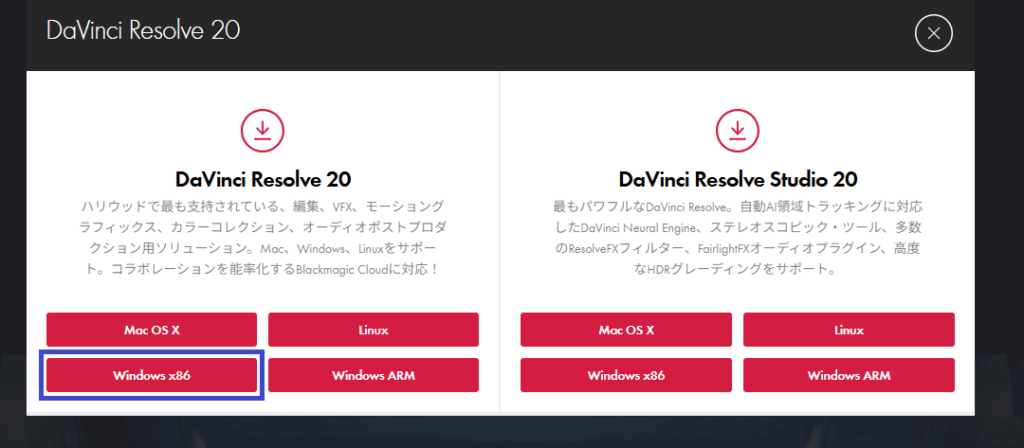 以下の画面が表示されました。今回は左下のWindowsx86をクリックします。