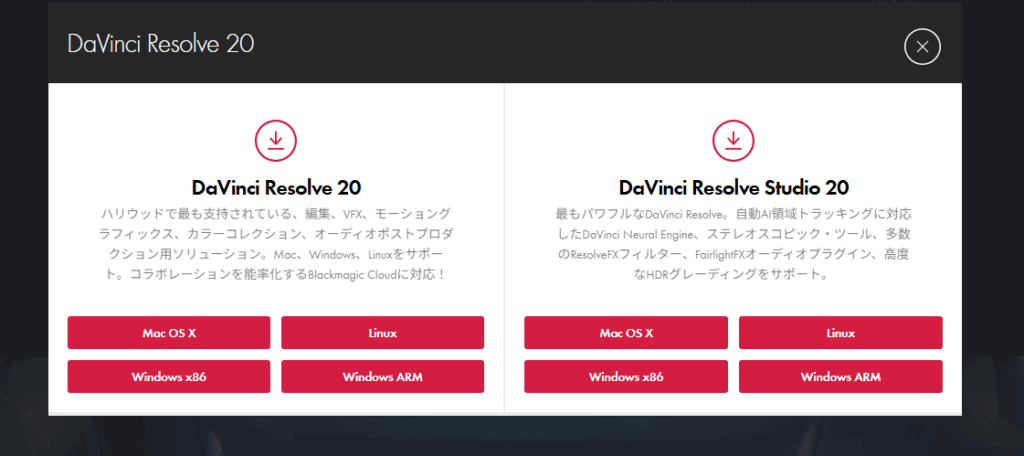 まずは、無料でDaVinci Resolveを使ってみます。まずはDaVinci Resolveをダウンロードしていきます。