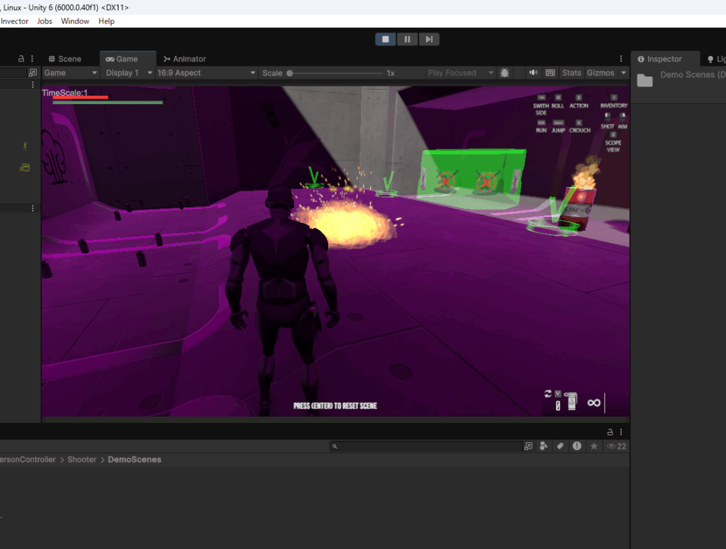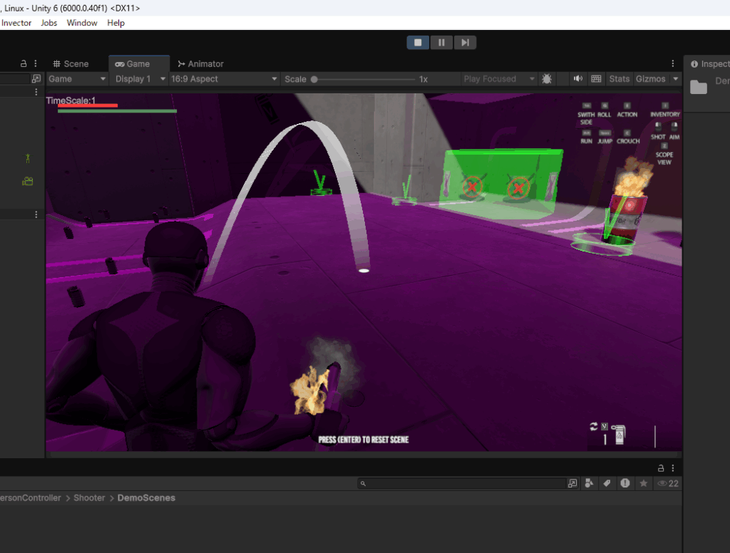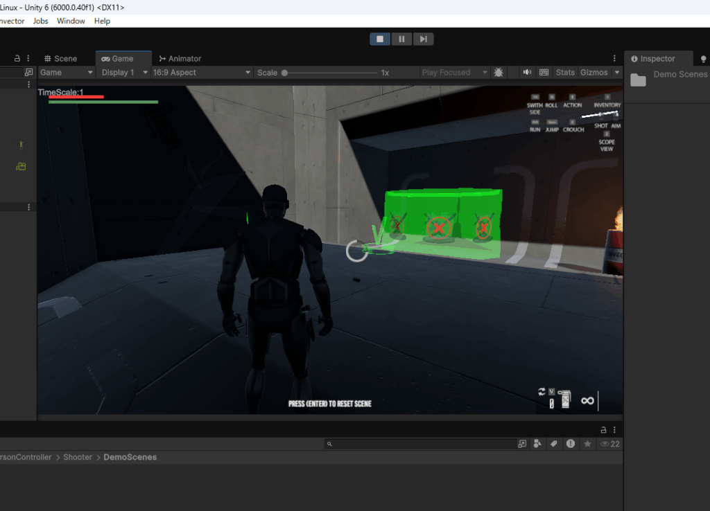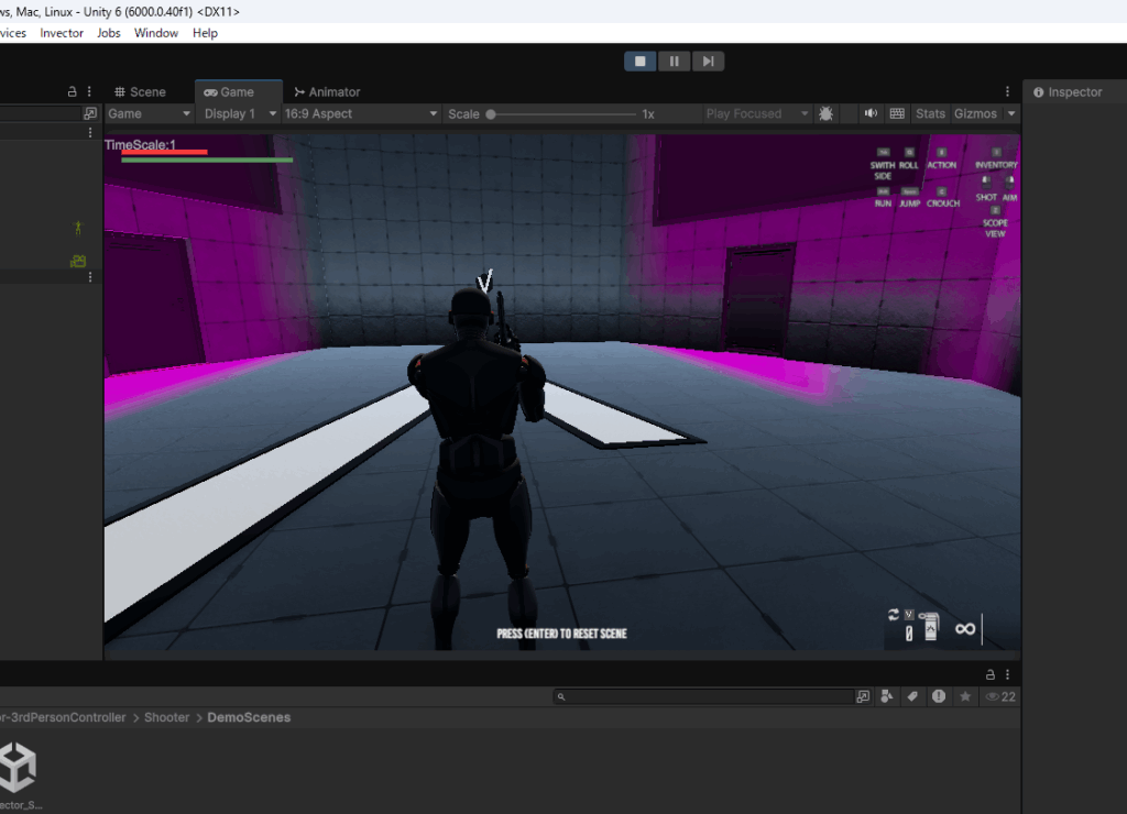 一番上のSHOOTER MELEE INVENTORYを選択してみます。これは銃と格闘とインベントリ(アイテムを格納するバッグの機能)があるシーンです。