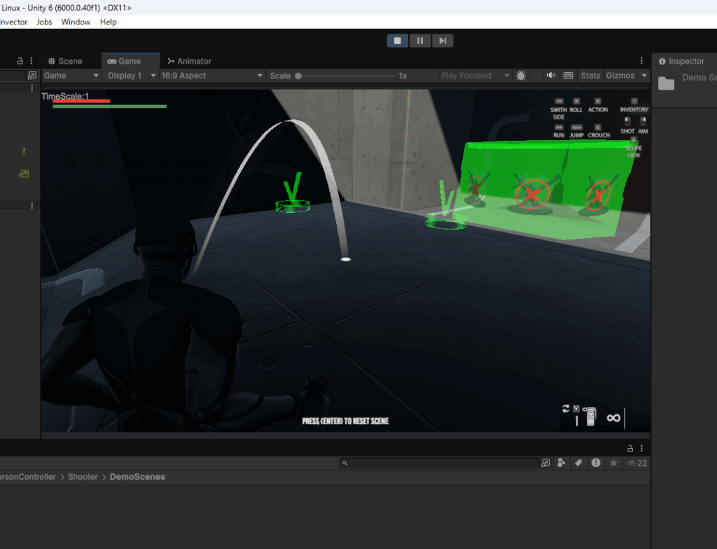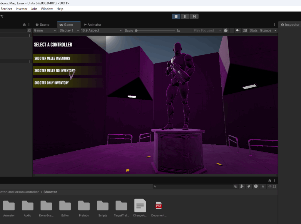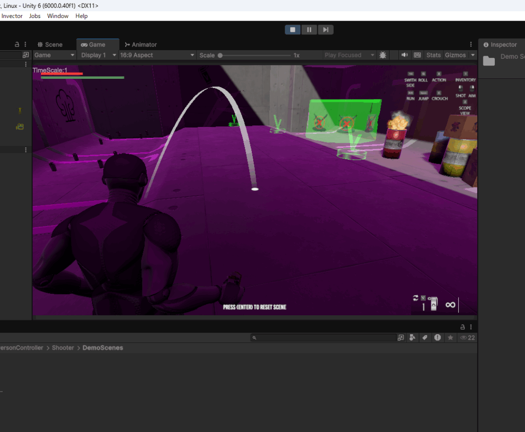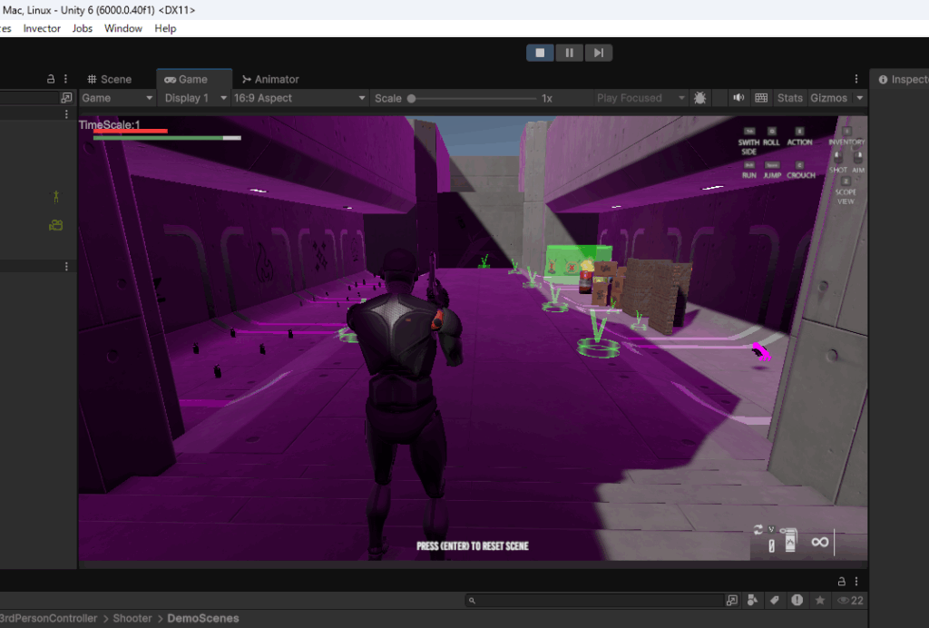 一番上のSHOOTER MELEE INVENTORYを選択してみます。これは銃と格闘とインベントリ(アイテムを格納するバッグの機能)があるシーンです。