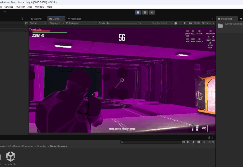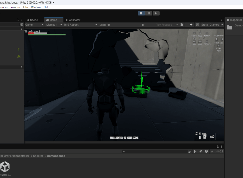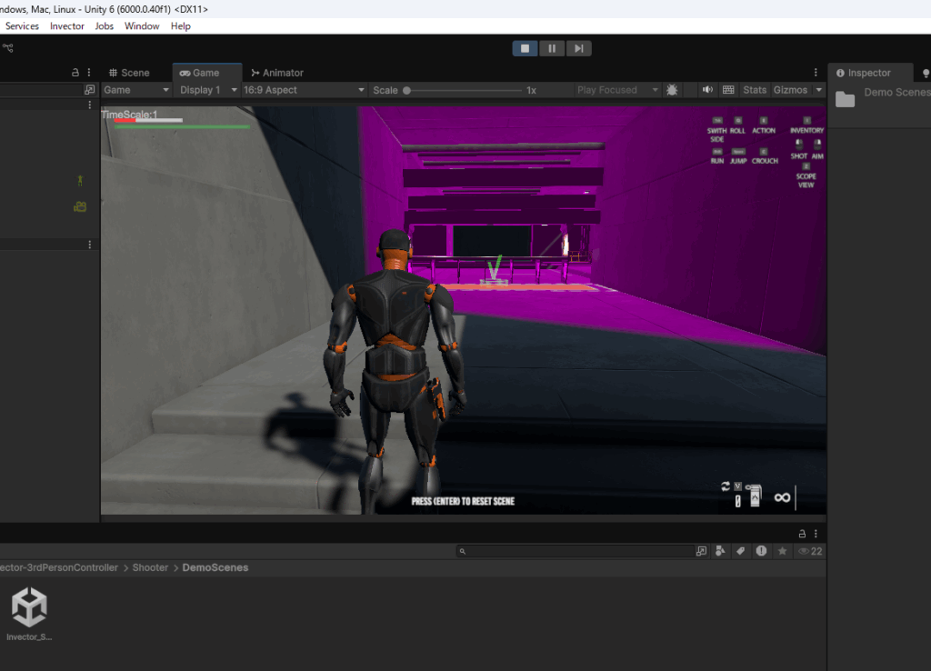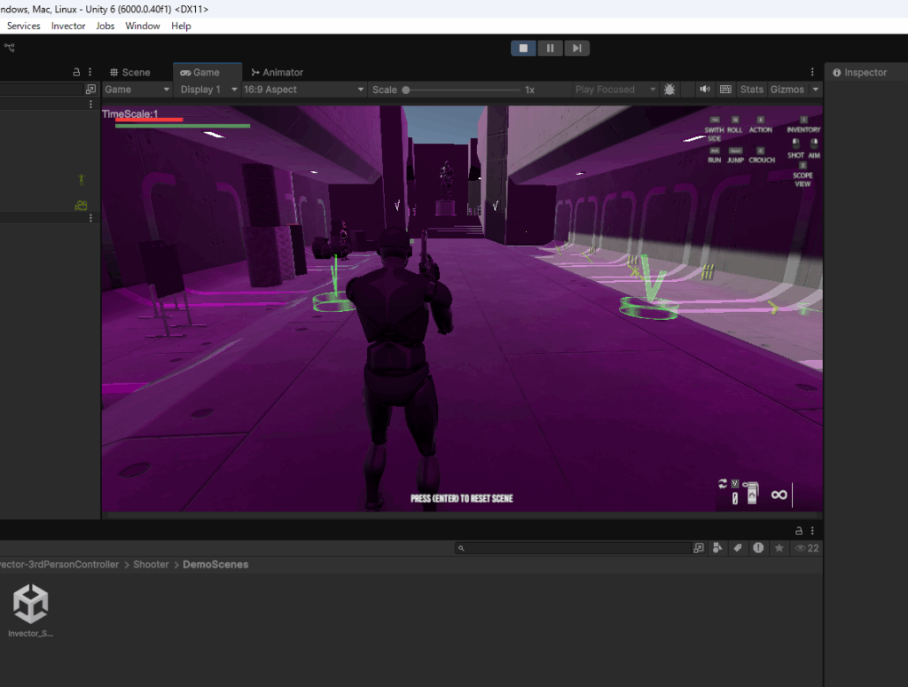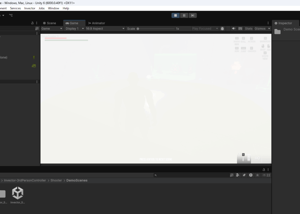 Assets>Invector-3rdPersonController>Shooter>DemoScenesフォルダに入っているShooterのデモシーンを確認します。