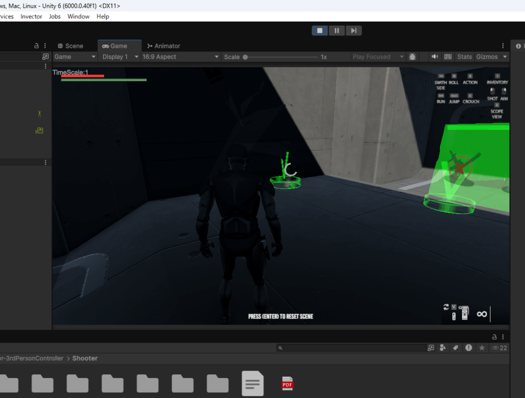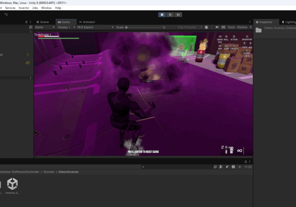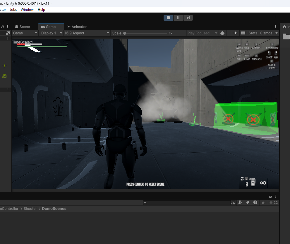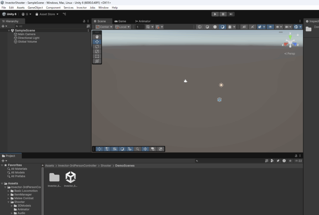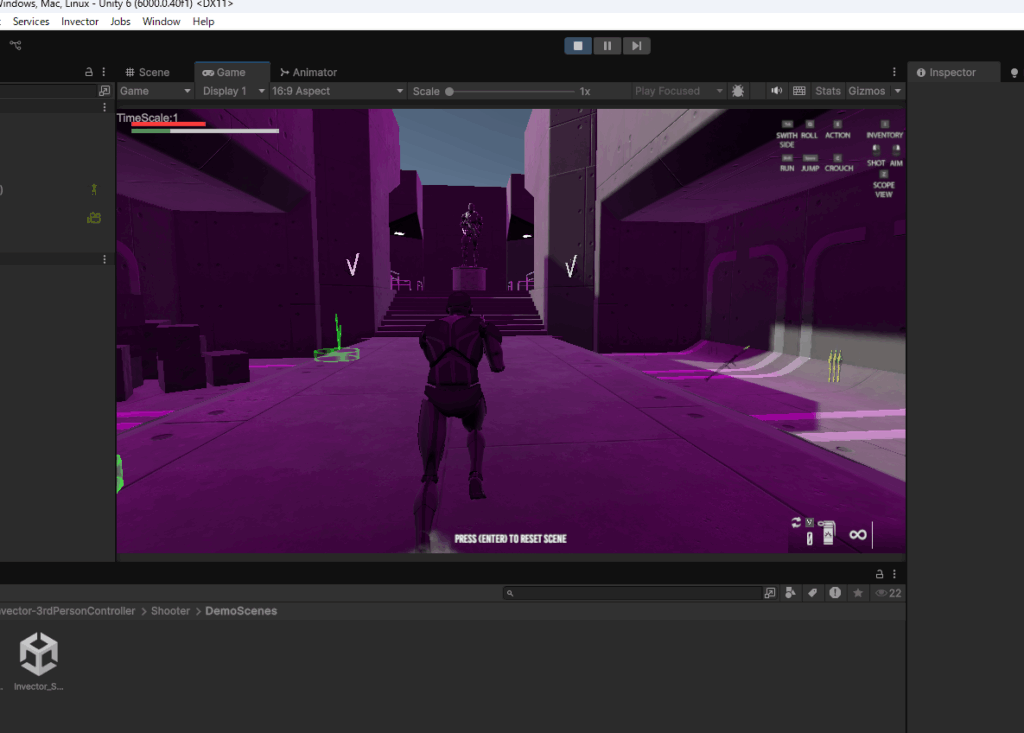 Assets>Invector-3rdPersonController>Shooter>DemoScenesフォルダに入っているShooterのデモシーンを確認します。