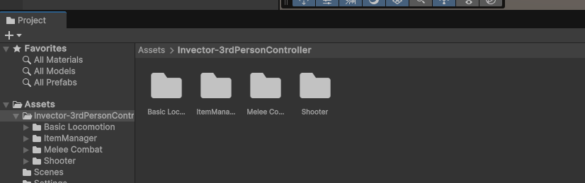ProjectウィンドウでAssetsフォルダにインポートされたInvector-3rdPersonControllerフォルダ配下を確認します。Shooter Templateには、Shooterだけでなく、BasicとMeleeも含まれます。