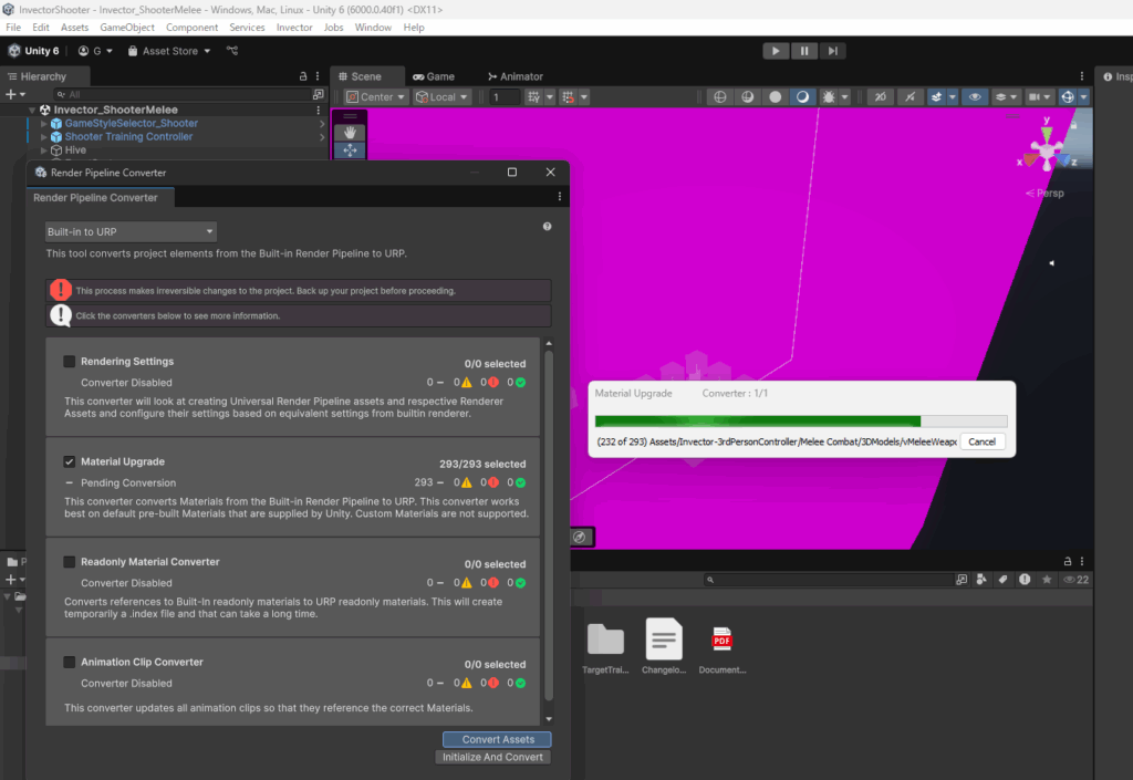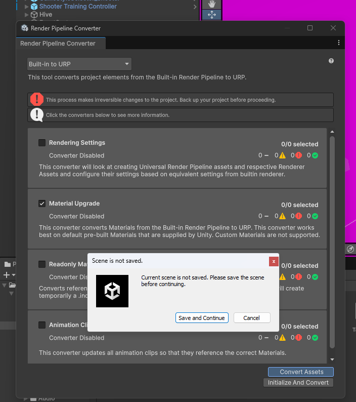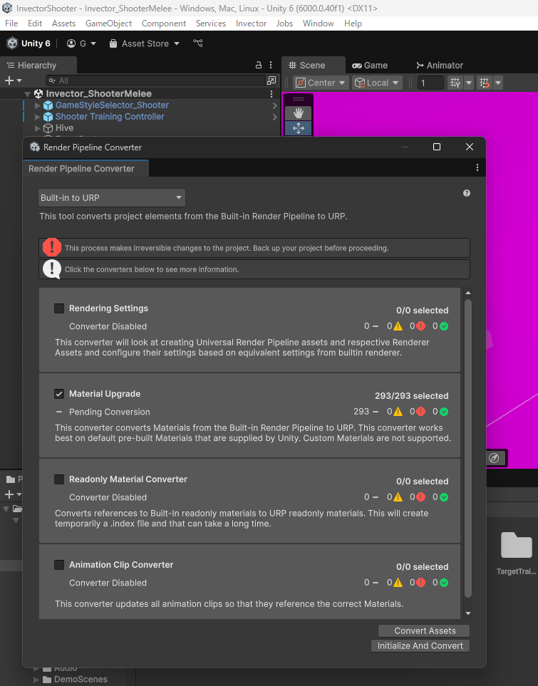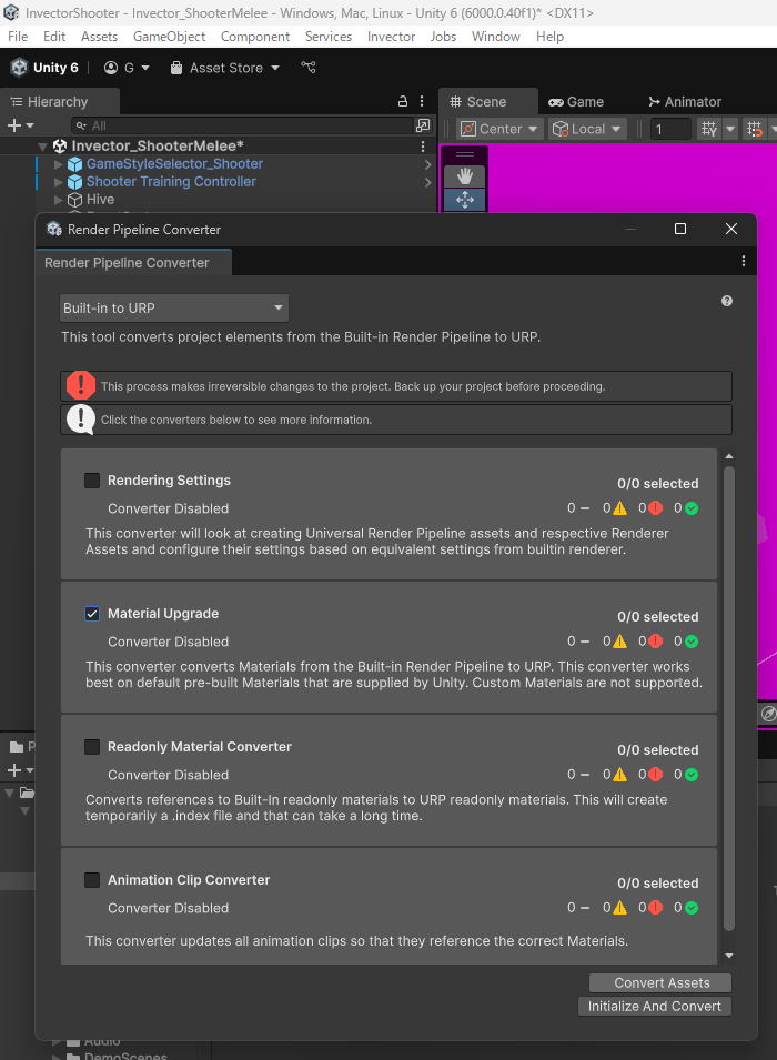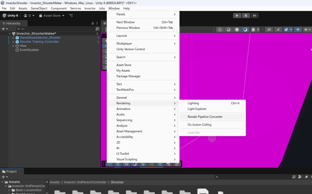プロジェクトがURPに対してアセットがBuilt inのためピンク色になっているので、URPに対応させます。Window>Rendering>Render Pipeline Converterをクリックします。