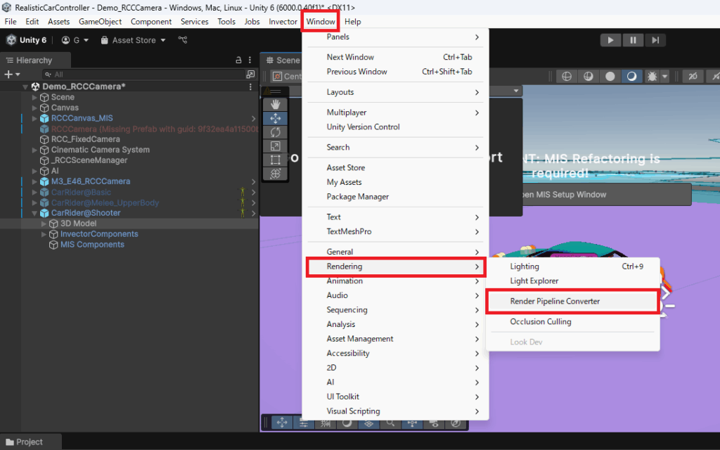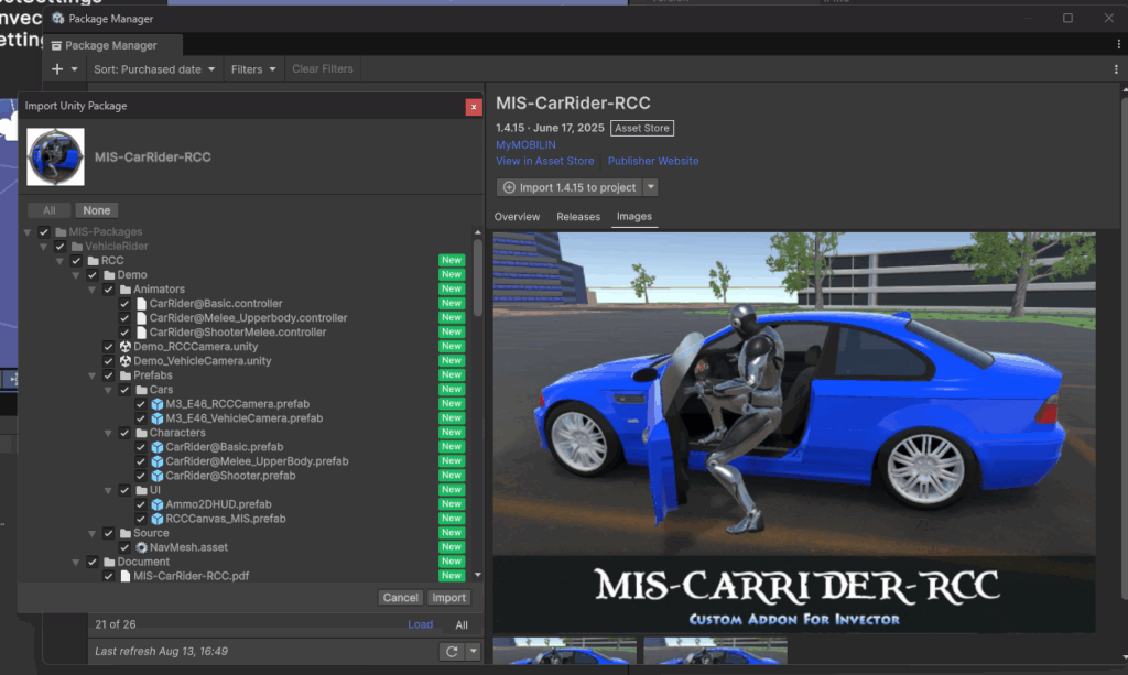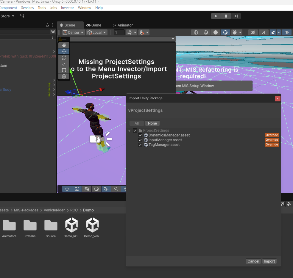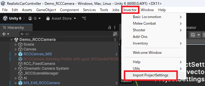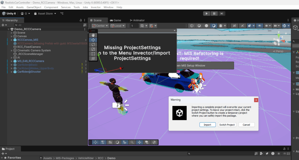 まずはRCCとInvectorとMISと名の付くアセットを一つのプロジェクトにインポートします。今回はRCCP(Proのほう)にInvectorをすでにインポートしてある状態で作業を進めます。