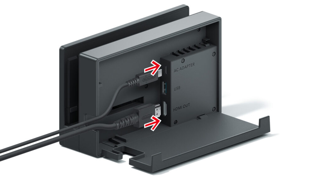 Nintendo Switch本体だけだと、HDMIケーブルが接続できないため、Nintendo Switch本体購入時に付属しているドックにNintendo Switchをセットして、さらに付属のHDMIケーブルをドックに接続します。