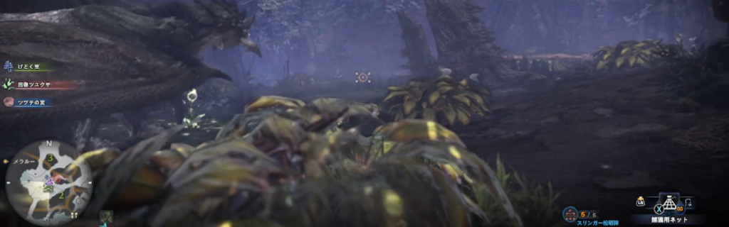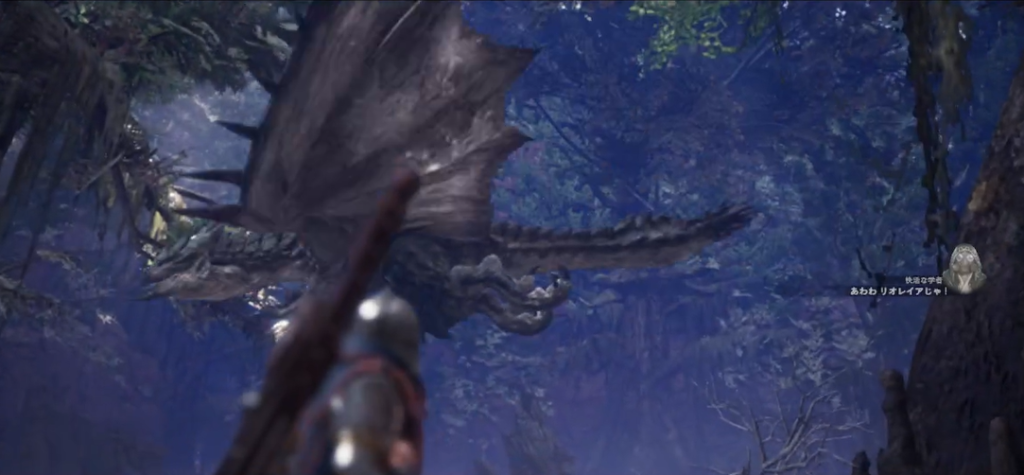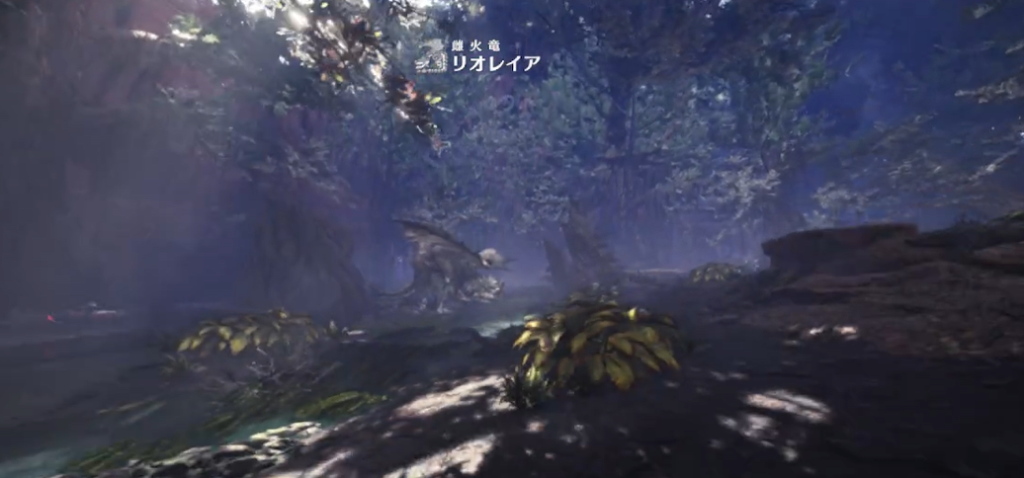 途中でリオレイアと遭遇します。狩猟する必要はありませんが、こちらへ襲ってこないよう、スリンガーを使って注意をそらします。