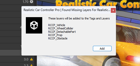 各ゲームオブジェクトのLayerとTagに値が追加される旨のウィンドウが表示されました。Addボタンをクリックします。