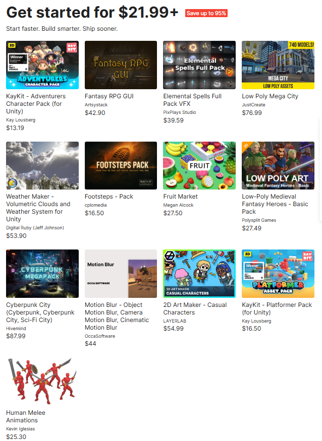 Unityが公式でピックアップしている場合が多く、商用レベルで使用できる高品質なアセットが割引価格で手に入るのも大きな魅力です。