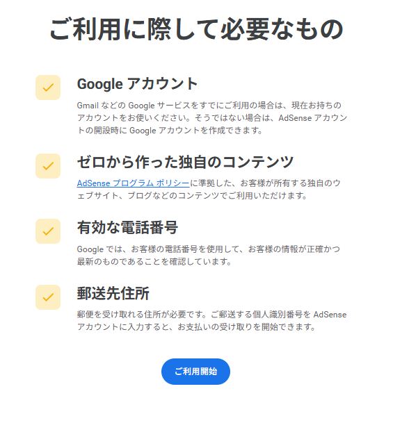 Google AdSenseを利用するには、Googleのアカウントと、電話番号、住所が必要です。