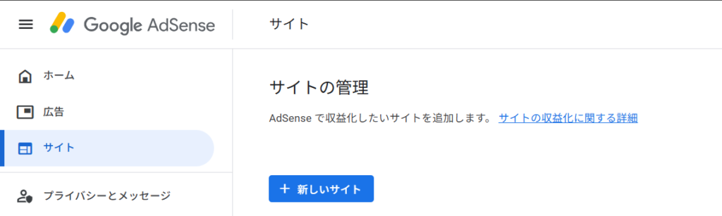 Google AdSenseの管理画面で、サイトタブから「+新しいサイト」ボタンをクリックします。