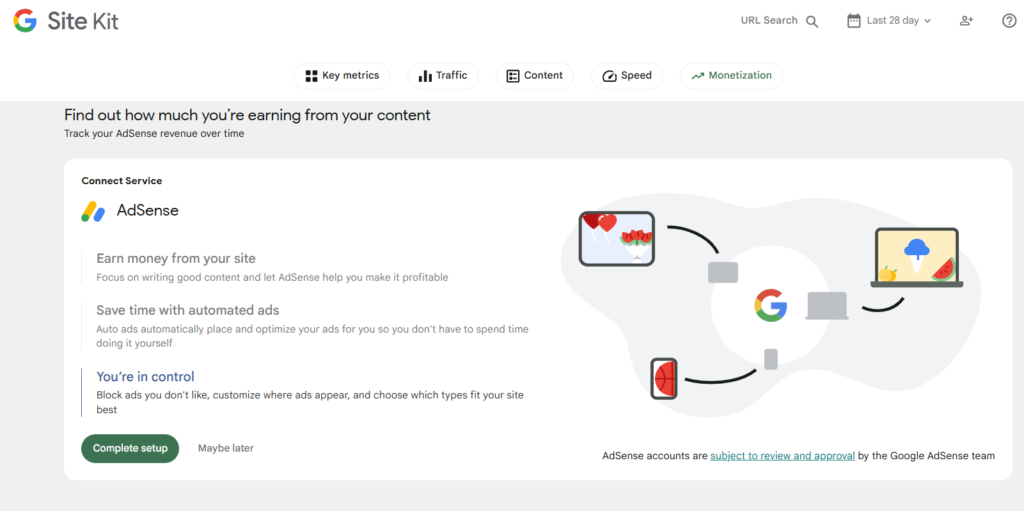 Site Kitタブから下へスクロールすると、AdSenseに関するページが表示されます。ここでComplete setupをクリックしてサイトをGoogle AdSenseと紐づけます。