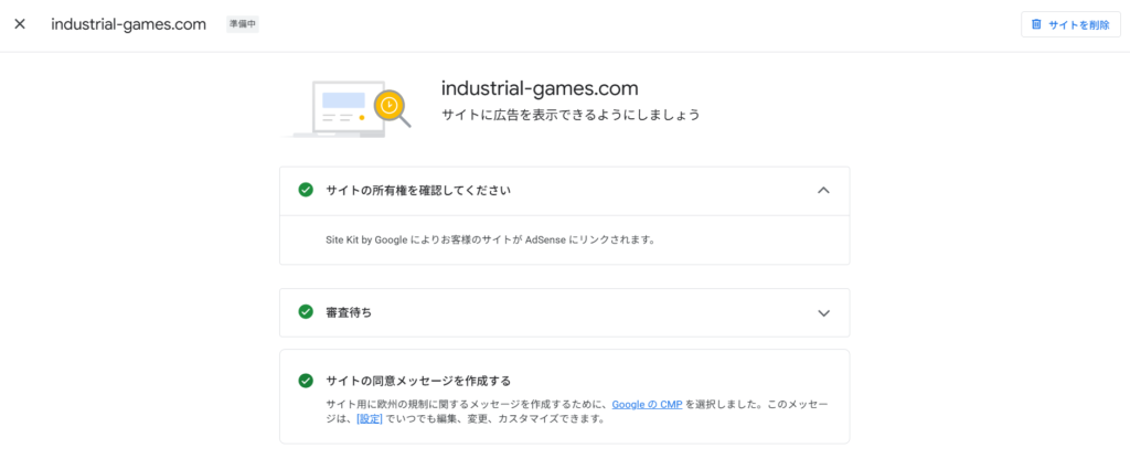 Google AdSenseとサイトの情報を紐づける必要があります。先ほどWordPress側にインストールしたGoogle Site Kitを確認します。